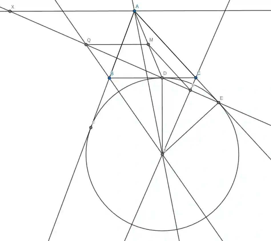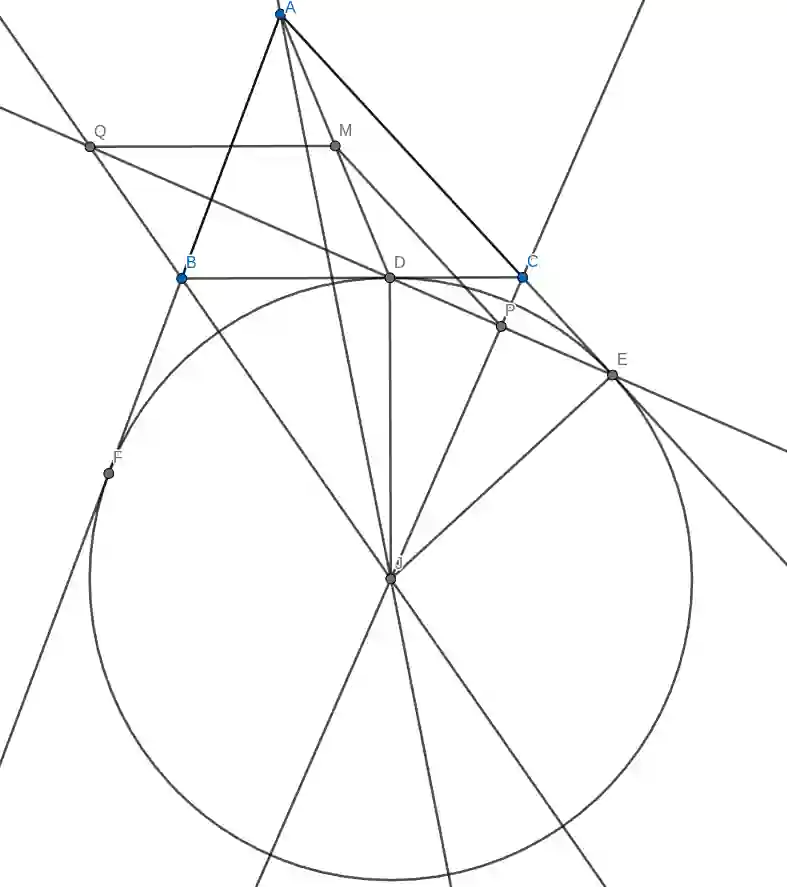 Dany jest trójkąt ostrokątny $ABC$. Okrąg o środku $J$ jest styczny do boku $BC$ w punkcie $D$, do przedłużenia boku $AC$ w punkcie $E$ i do przedłużenia boku $AB$ w punkcie $F$. Prosta $DE$ przecina proste $CJ$ i $BJ$ odpowiednio w punktach $P$ i $Q$. Punkt $M$ jest środkiem odcinka $AD$. Wykazać, że $PM = QM$.