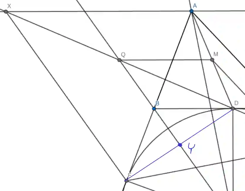 Zatem, już mamy wszystko by stwierdzić, że odcinek $QY$ jest odcinkiem łączącym środki boków w trójkącie $FXD$, a zatem z twierdzenia Twierdzenie 1 wynika, że $QY \parallel XF$.